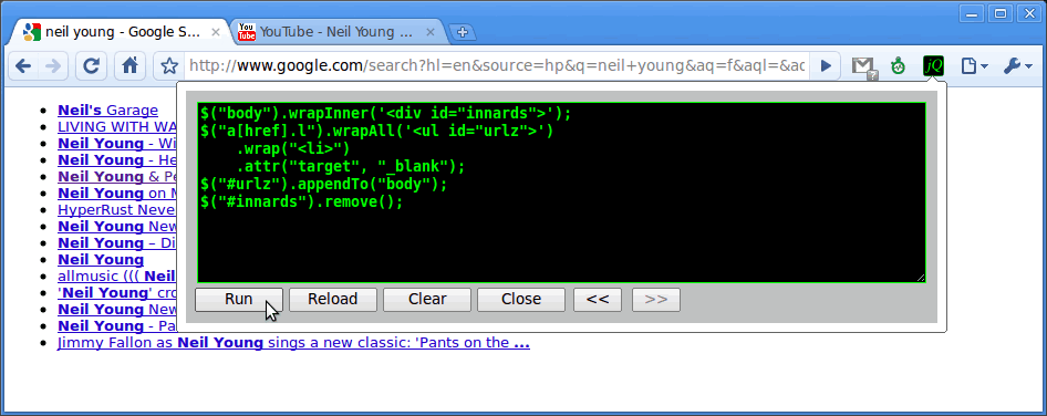 jQuery Shell proširenje omogućuje pokretanje JavaScript i jQuery komandi u kontekstu aktivne web stranice. Proširenje je prilično korisno prilikom izrade web stranice kada eksperimentirate sa JavaScriptom odnosno jQuerijem ili pak ako želite naučiti iste.