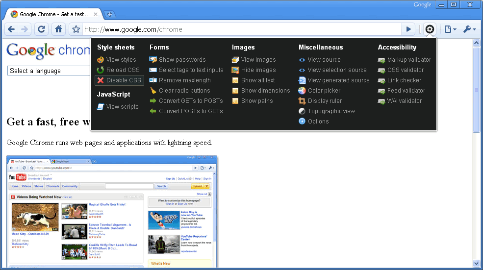 Web Developer je proširenje nastalo (već pogađate) po uzoru na istoimenu ekstenziju za Firefox web preglednik. Ovo proširenje sadrži niz alata za pregled stranice te pregled raznih informacija o web stranici i njenih sastavnih dijelova (css, javascript, headers...). Neke od najkorisnijih mogućnosti su ravnalo za mjerenje veličine elemenata web stranice, resizer za testiranje izgleda web stranice na monitorima drugačije veličine, validacija ispravnosti programskog koda, debagiranje formi i još mnogo toga.