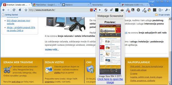 Webpage Screenshot je proširenje koje naprosto mora imati svatko tko se bavi web dizajnom i izradom web stranica. Proširenje omogućuje "hvatanje" slike cijele web stranice (a ne samo dijela stranice koji je trenutno vidljiv na ekranu). Nakon "hvatanja", slika se može snimiti na disk u png-formatu.
